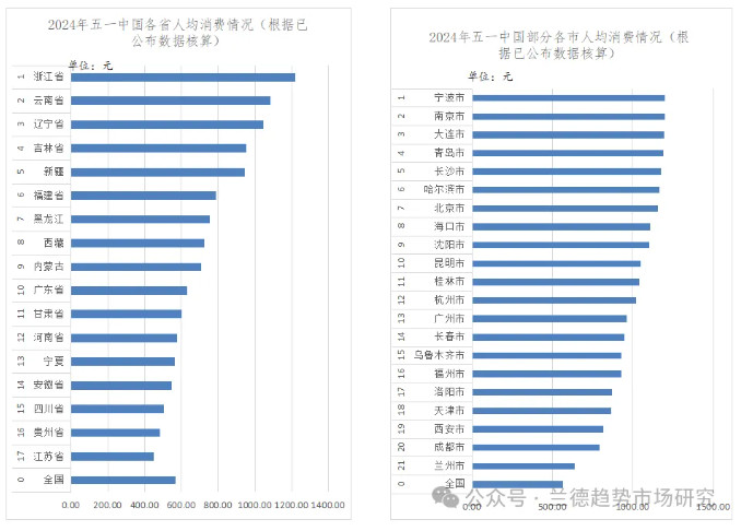 據數據測算,五一全國旅游人均消費維持在565.73元。2024年五一期間旅游人均消費省排名中,浙江、云南、遼寧、吉林、新疆排名前五;市排名中,寧波、南京、大連、青島、長沙絕對值排名前五。