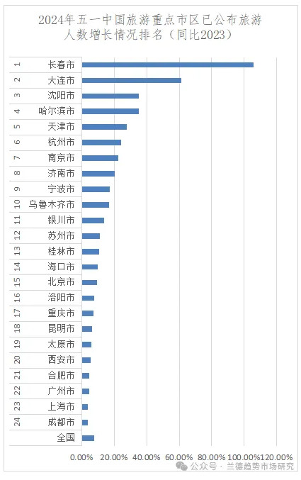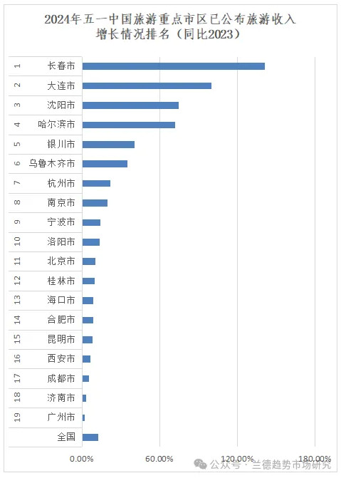 引入增長統計的原因在于,旅游絕對值數據受經濟、人口、地域面積、旅游資源分配等影響,即便統計結果準確也不能反映當地旅游發展速度,增長統計結果在一定程度上能夠看出當地當年或者當期在旅游經濟發展上所做的努力。增長率統計主要采用的是2024年五一和2023年五一同比數據。